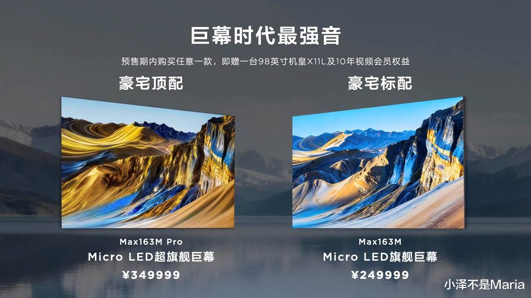 在普及SQD-Mini LED的同时,TCL还带来巨幕时代的最强音——163吋Micro LED旗舰巨幕双曜登场。豪宅顶配的Max163M Pro与豪宅标配的Max163M,均搭载2488万多颗无机自发光芯片,实现真4K实像素,其中Max163M Pro峰值亮度直达XDR 10000+nits。从2024年百万元级到如今Max163M定价249999元,TCL正将Micro LED从遥不可及的收藏品变为豪宅首选,让超沉浸式的巅峰画质体验进入更多家庭。