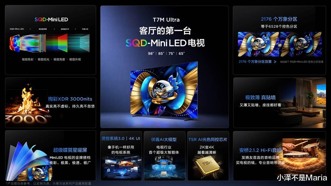 本次发布会还带来客厅的第一台SQD-Mini LED电视TCL T7M Ultra。作为六大维度技术进阶的全能选手,T7M Ultra搭载2176个万象分区(分区数与6528个分区的RGB电视相等)与绚彩XDR 3000nits峰值亮度,承袭100%BT.2020全局高色域的技术基因,配合安桥2.1.2声道Hi-Fi音响,同样成为全能无短板的影游搭子。