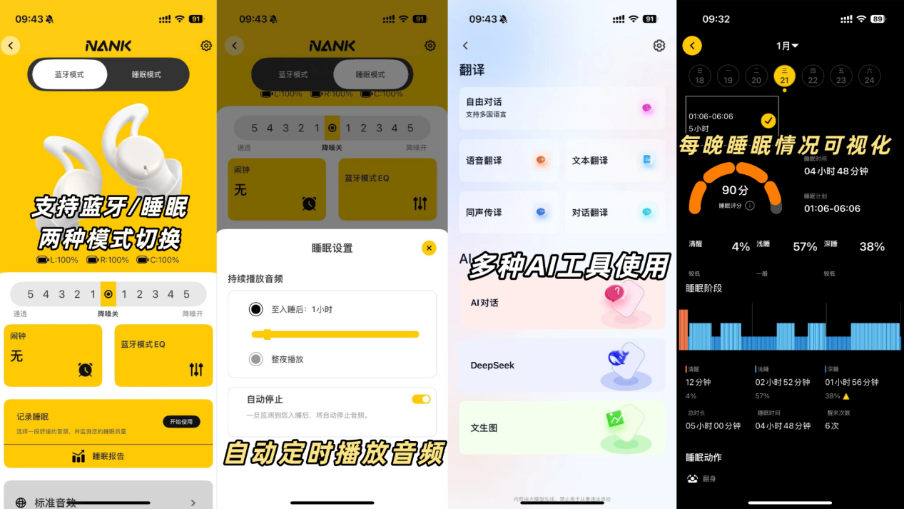 在降噪能力上,南卡DeepSleep完全达到旗舰级别,其配备的BioShell仿生腔体,可在噪音侵入耳道前完成前置消隐,配合ANC分频降噪引擎,针对低频呼噜声、中频人声、高频杂音实现分段压制。双耳6麦克风阵列全方位360度捕捉环境音,一键开启后,瞬间就能营造出声学静谧舱般的体验!内置5段降噪深度和5段通透模式,可按需自由调节,既能满足夜晚深睡、白天小憩的静音需求,又能在安静中感知闹钟呼唤,轻松平衡不同场景。此外,配套APP依托NANK DeepSleep算法,精准追踪深睡、浅睡、清醒全睡眠阶段,支持睡姿检测,入睡后自动停止音频播放,醒来以轻柔闹钟唤醒,还能生成可视化睡眠报告,让睡眠更具科学性与安心感。