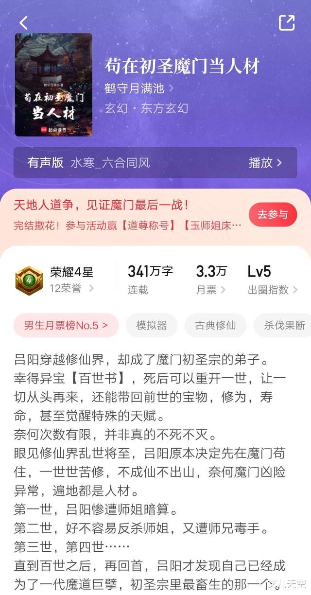 去年起点大热之作,十二天王第一名,不出意外今年应该就要直升大神。百世书类型的魔修文,不多赘述了。