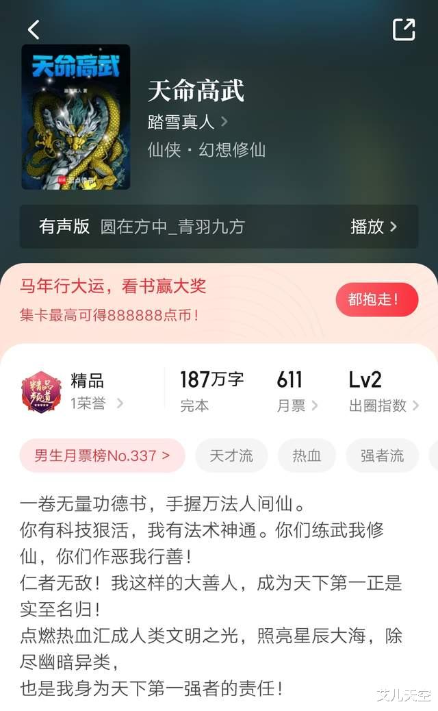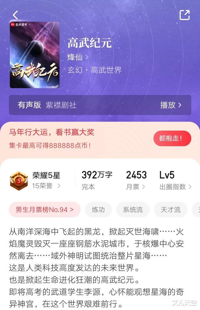 烽仙作品,写了近两年,小说到过十万订,也帮助其拿到了大神约。星际高武题材,武道高考,灵性觉醒生命进化。