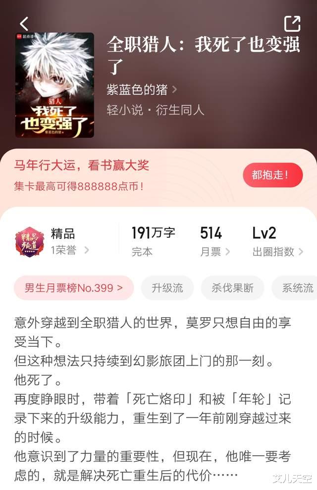 小说写了一年三个月,八千订以上大精品成绩。作者之前已经写过两本全职猎人同人,一本万订,一本也是精品。