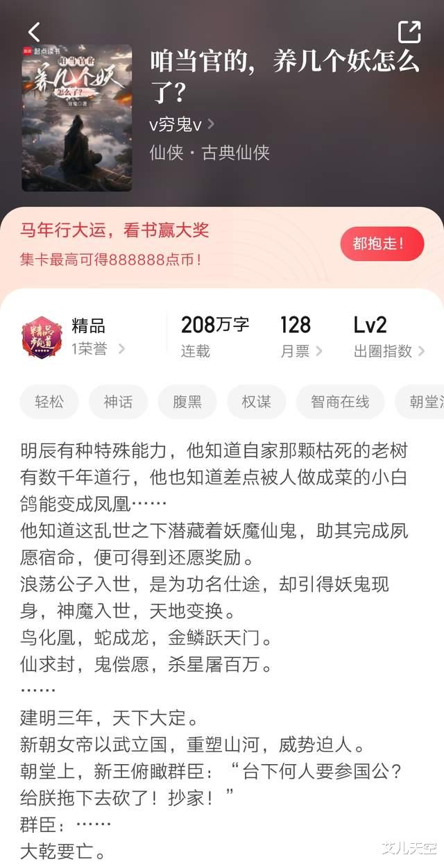 1、《咱当官的,养几个妖怎么了?》208万字完本