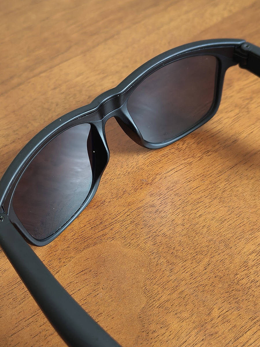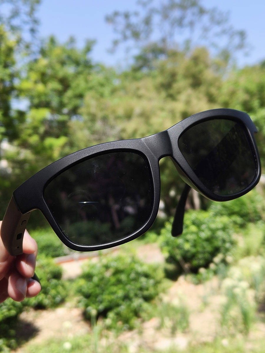 这副眼镜外观跟普通墨镜差不多,只是镜腿由于内置喇叭和麦克风厚了一些,但整机只有40g,非常轻量化的设计,久戴不压鼻梁、不夹脸,通勤、运动戴一整天都无负担。UV400防护镜片还能防紫外线,戴上视野也非常清晰。
