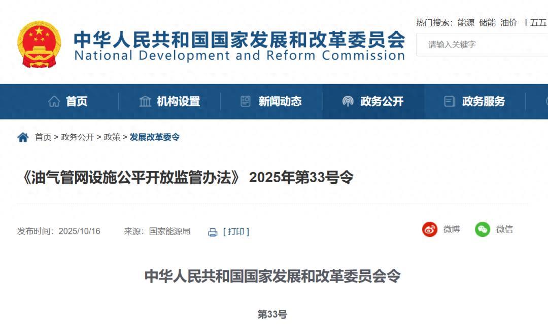 国家发改委网站10月16日消息,《油气管网设施公平开放监管办法》已经2025年9月26日第23次委务会议审议通过,现予公布,自2025年11月1日起施行。