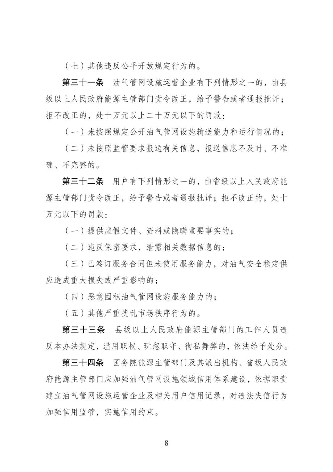 二是新增公平开放罚则条款。与能源法中公平开放罚则充分衔接,明确油气管网设施运营企业违反规定的9种情形,并根据不同违规情形设置相应的处罚标准,便于各级能源主管部门一线执法。同时,为防止部分用户恶意扰乱市场秩序,明确用户违反规定的5种情形,保障油气市场秩序稳定有序。