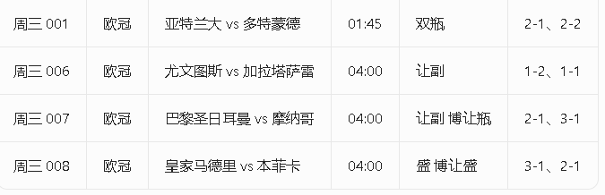 各位兄弟,刚刚泡了杯浓茶,对着屏幕把今天的比赛数据、伤停报告又捋了一遍,这才过来跟大伙儿聊聊。十年看球,不敢说料事如神,但求把功课做足,把门道看清,咱们一起侃球,图个乐子,也图个明白。周三001 欧冠 亚特兰大 vs 多特蒙德 01:45