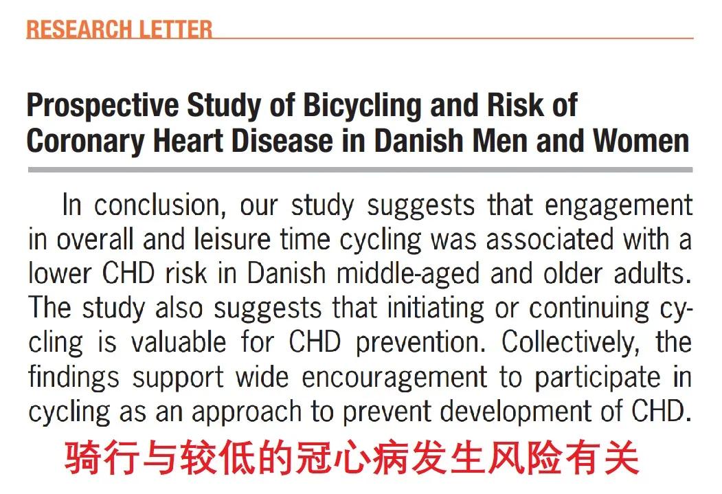 有研究者就以丹麦骑自行车的人群为对象,前瞻性地分析了骑自行车和冠心病的关系,该研究结果于2016年发布在心内科领域顶级期刊CIRCULATION上。
