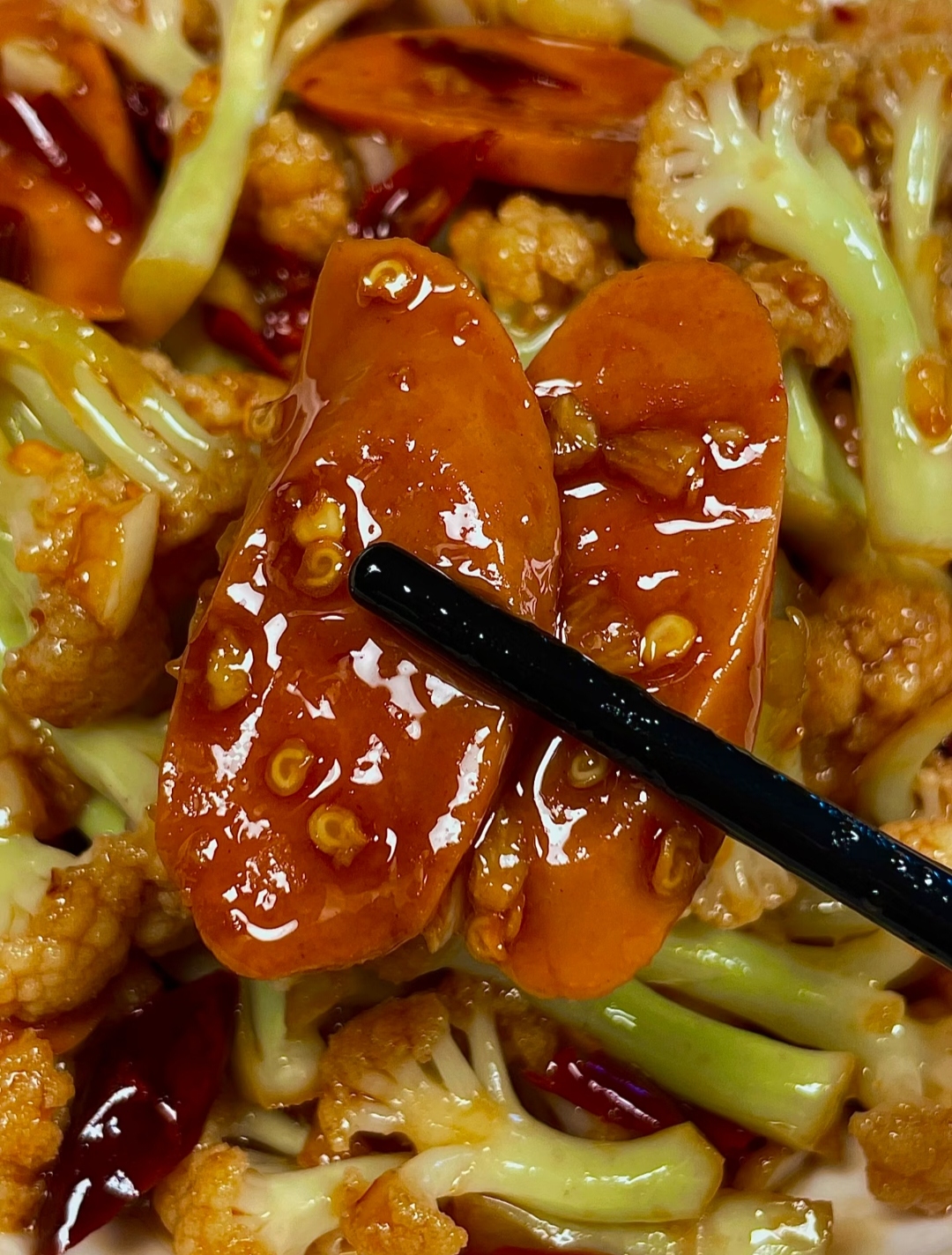 看到花菜颜色油亮,火腿肠边缘微卷,就可以关火出锅了!整个过程从下锅到出锅不超过3分钟,真正体现了"快手菜"的精髓。
