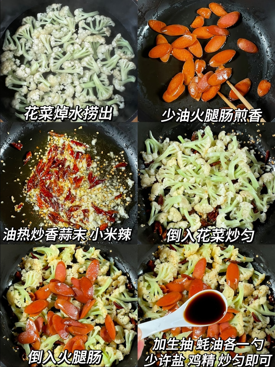 把煎好的火腿肠倒回锅里,快速翻炒均匀。接着加入1勺生抽、1勺蚝油,少许盐和鸡精。这里有个小技巧:调料可以事先在小碗里调匀,一次性倒入,避免手忙脚乱。快速翻炒30秒,让每一片花菜和火腿都均匀裹上酱汁。
