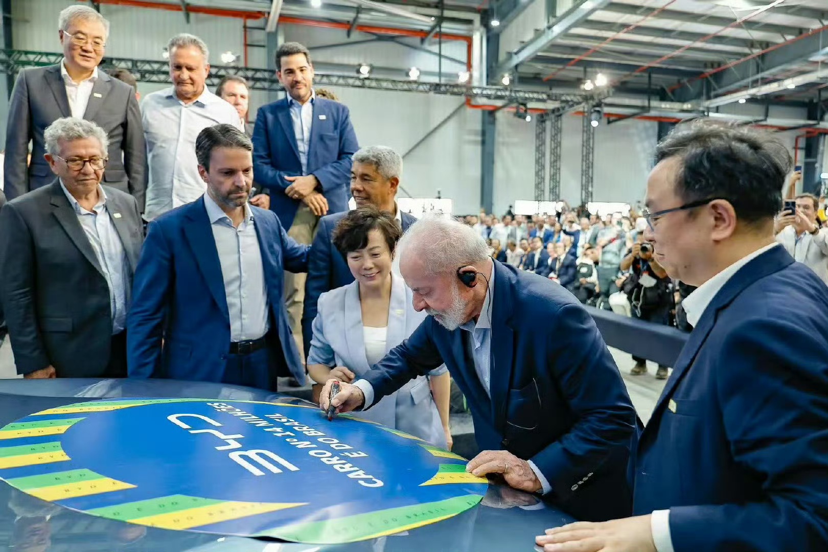 巴西巴伊亚州卡马萨里—10月9日,比亚迪第1400万辆新能源汽车在巴西乘用车工厂正式下线,标志着比亚迪全球化开启全新篇章。巴西总统卢拉、副总统杰拉尔多·阿尔克明、中国驻巴西大使祝青桥、巴伊亚州州长热罗尼莫·罗德里格斯、比亚迪董事长兼总裁王传福等嘉宾,以及多位政府官员和比亚迪员工代表出席并见证了这一重要时刻。