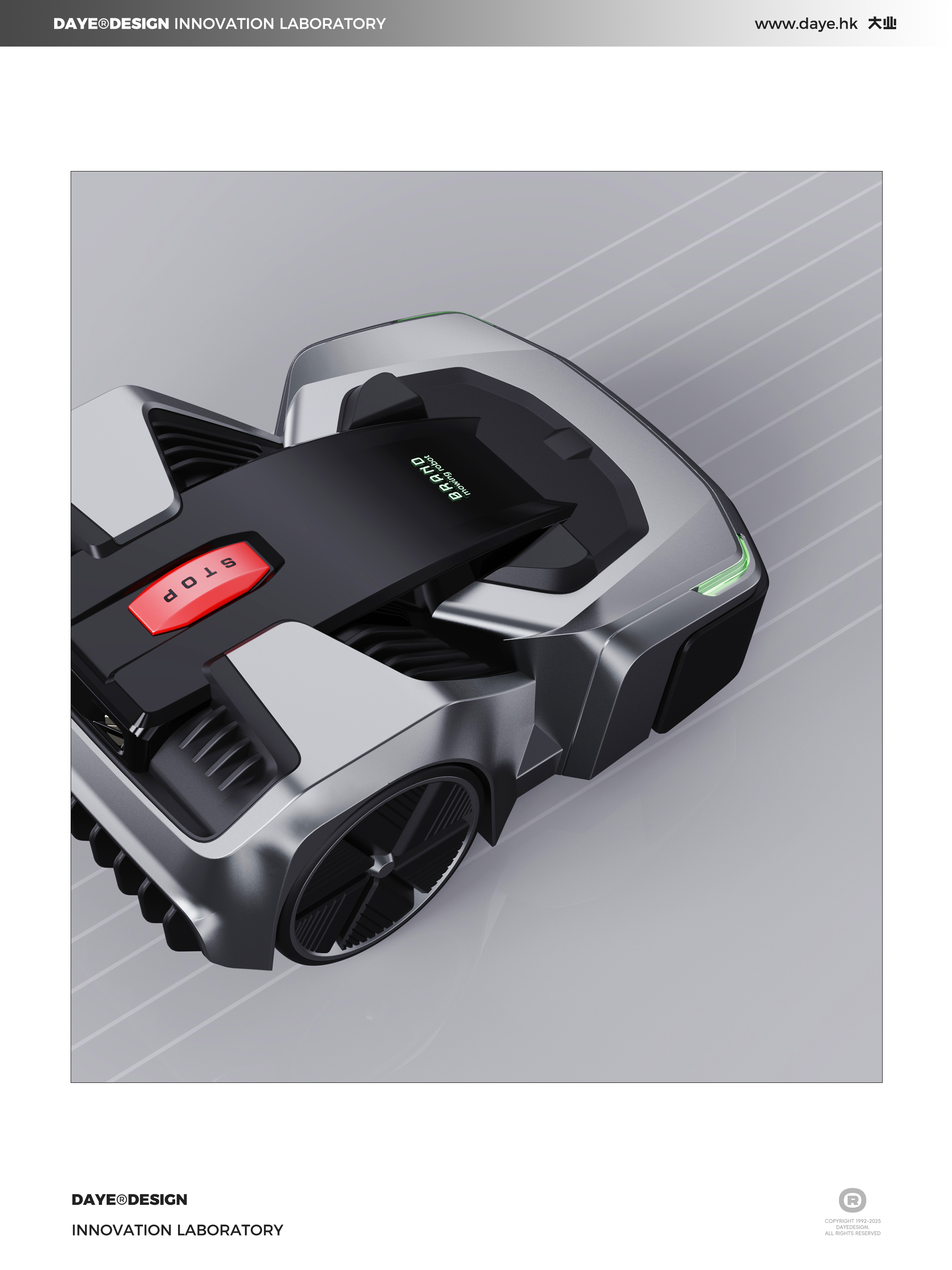 本割草机器人外观以硬朗几何线条为基础,构建极具科技感与机械张力的造型。整体采用银灰与黑色为主色调,沉稳且富有未来感,搭配红色急停按键、绿色状态灯带,形成视觉焦点与功能提示。