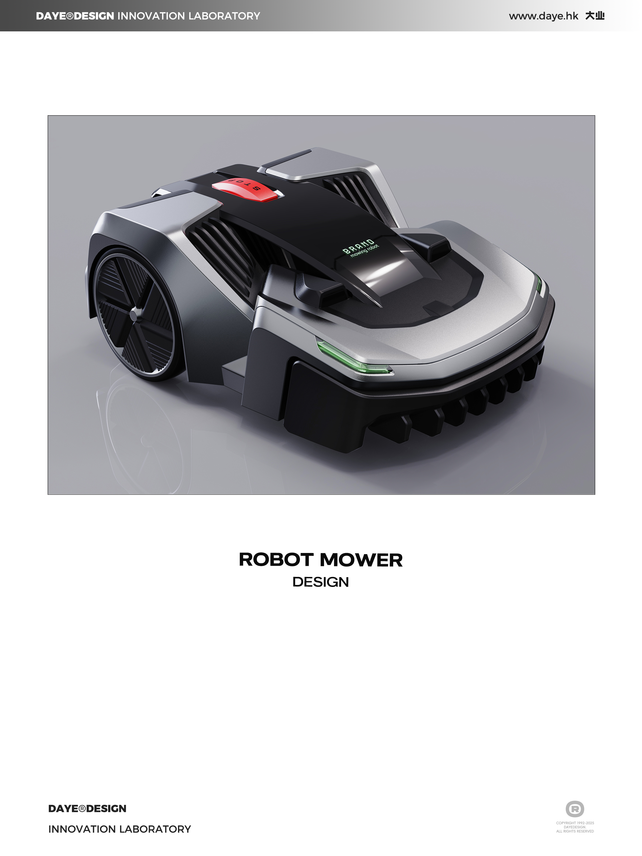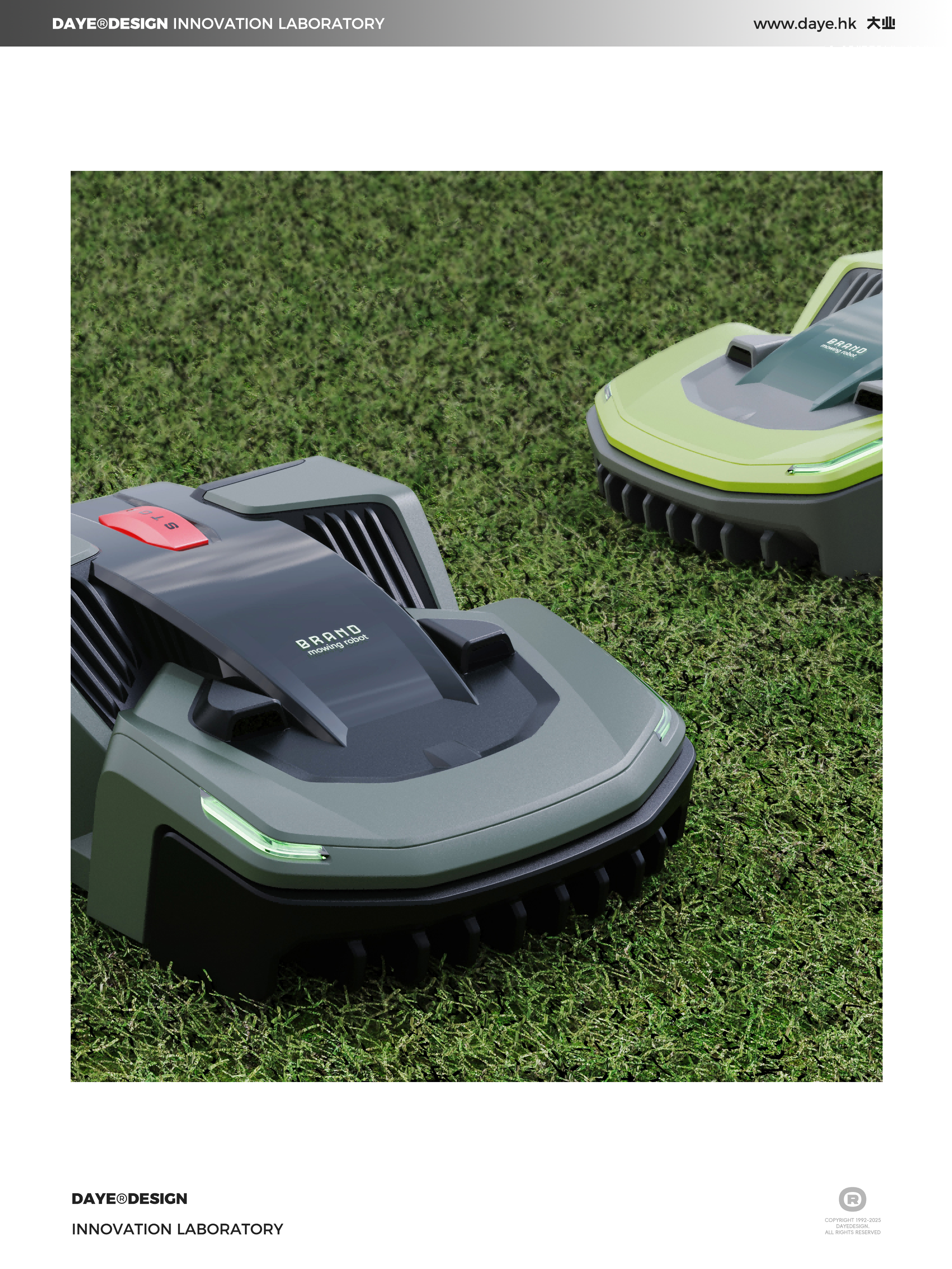 车身曲面与平面精准衔接,车头两侧绿色灯带呈嵌入式弧面造型,光线穿透半透明材质,既作运行状态显示,又强化科技氛围;顶部 “BRAND mowing robot” 标识区域为微弧面,与周边硬朗线条形成对比,凸显品牌同时优化视觉层次。