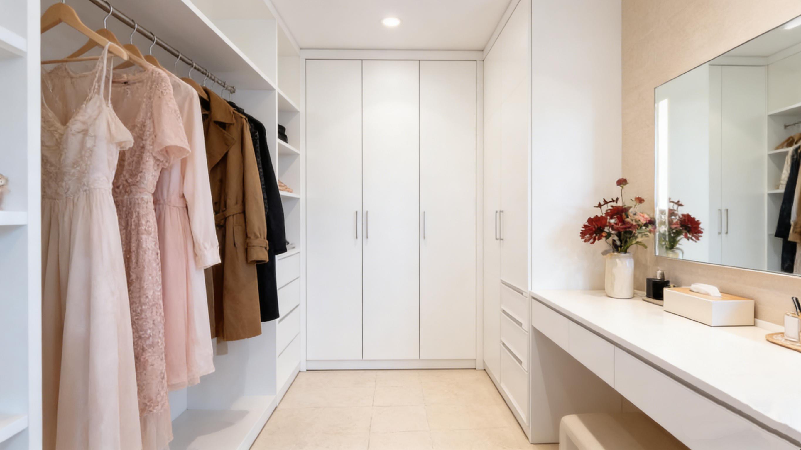 把主卫改成衣帽间,是网传最火的方案,但主卫上下楼都是潮湿的卫浴空间,因此容易受潮,一旦出现漏水问题,很可能会毁掉整个衣帽间与衣物。