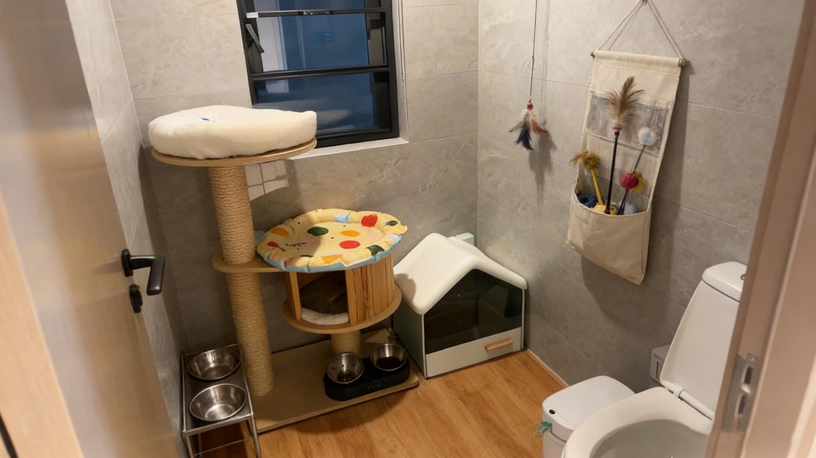 把主卫淋浴区改成宠物房——给宠物一个专属空间,却会侵占你的个人空间。因为宠物的毛发、粪便……容易滋生细菌和异味,扩散到卧室,影响您的健康,反而得不偿失。宠物房更适合放在阳台或客厅角落,这些区域通风好。