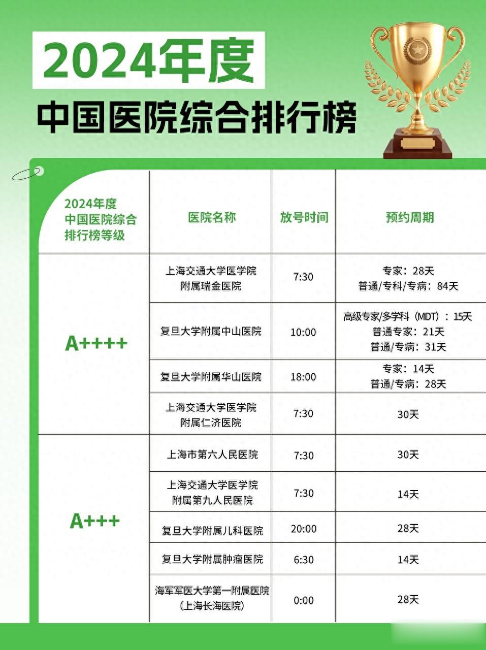 1️⃣A++++ 级 瑞金:7:30 放号,专家号预约周期 28 天 中山:10:00 放号,高级专家 / 多学科 (MDT) 号预约周期 15 天,普通专家号预约周期 21 天 华山:18:00 放号,专家号预约周期 14 天 仁济:7:30 放号,预约周期 30 天
