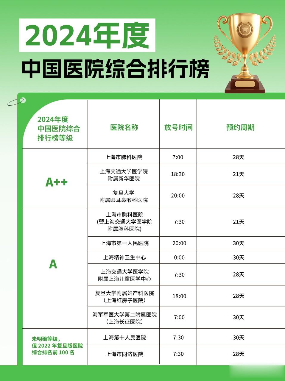 你在挂号之前,知道每家医院的放号时间吗? 根据《2024年度中国医院综合排行榜》,我们筛选出上海市排名1~20的医院放号时间&预约周期,供大家参考。