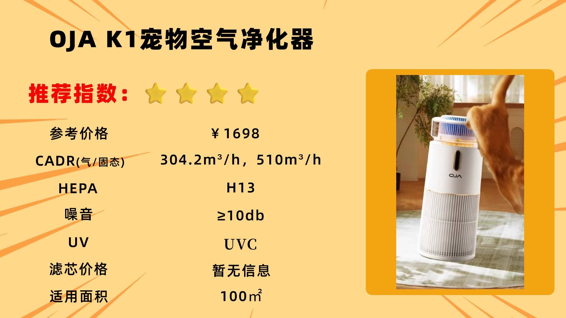 OJA 宠物空气净化器在设计机身尺寸时,充分考量了养宠家庭的现实使用需求。它采用紧凑化机身设计,不仅节省室内空间,还方便用户在不同房间灵活挪动。净化器搭载的无刷电机吸附效果佳,可有效吸附空气中的浮毛和颗粒杂质。其配备的 AOP 除菌系统,能定向清除 6 种常见宠物致病菌;配合活性炭滤网吸附宠物尿味、粪便异味的同时,还能减少利于细菌滋生的潮湿环境,对家中有过敏体质成员的家庭十分友好。该产品日常运行噪音约 52dB,开启睡眠模式后噪音进一步降到 55dB 左右,夜晚放置在客厅或宠物活动区,不会影响家人和宠物的休息质量,深夜使用也无明显干扰。