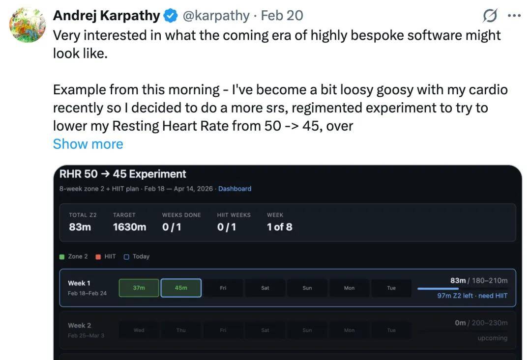 他以自己正在进行的有氧运动为例,没有选择去应用商店搜索任何一款「心率管理工具」,而是直接命令 AI 逆向工程了跑步机的云端 API,为自己量身定制了一个为期八周的、极其私密的实验仪表盘。