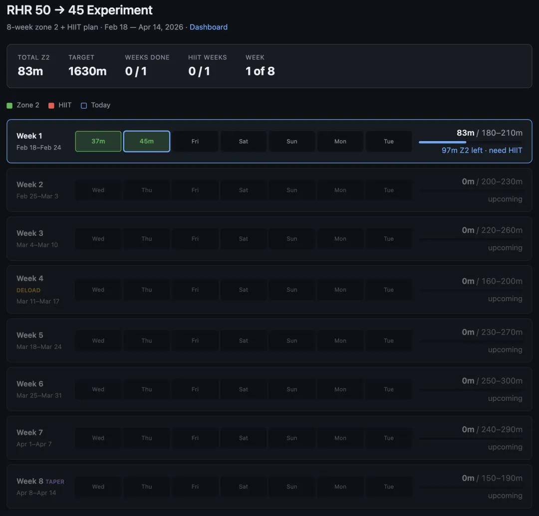 最近我在做 cardio(有氧运动)时有点松懈,所以决定认真做个为期八周的实验性训练,目标是让静息心率从 50 降到 45。主要方式就是达到 Zone 2(二区)有氧的累计分钟目标和每周一次 HIIT(高强度间歇训练)。
