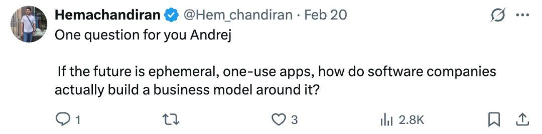 「请教 Karpathy 一个问题:如果未来是临时性的、一次性的应用,那软件公司要怎么围绕这个建立商业模式?」