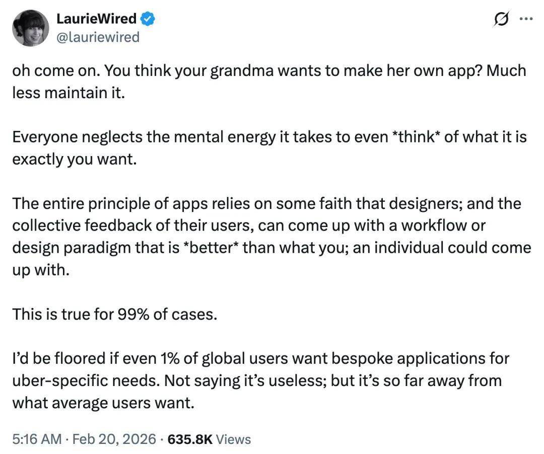 「得了吧。你真觉得你奶奶想自己做个 App?更别说还要维护它了。大家都忽略了一点,光是「想清楚自己到底想要什么」这件事本身就已经需要消耗大量的心力了。App 存在的整个逻辑,某种程度上是建立在这样一种信任上的:设计师们,加上用户们的集体反馈,能够设计出一种工作流或交互范式,它比你单打独斗想出来的要更好。这在 99% 的情况下都是成立的。就算全球有 1% 的用户想要为那种超级特定的需求搞定制化应用,我都会惊掉下巴。不是说这东西没用,但它离普通用户想要的实在差得太远了。」