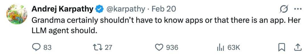 Karpathy 进行了回击,「奶奶当然不需要懂什么 App,甚至不需要知道有 App 这回事。她的 LLM 智能体懂就行了。」
