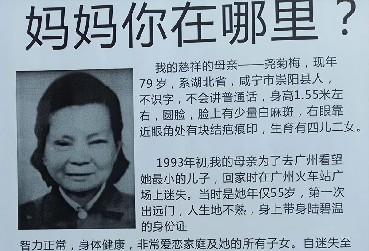 1990年代的寻人,没有互联网也没有手机定位。子女们能做的,无非是四处贴小广告、守火车站、托媒体。广州街头,那张印着“寻母启事——尧菊梅,女,55岁,湖北口音,不识字,身高一米五四”的黑白传单,被电线杆、公交站牌、甚至垃圾桶贴得密密麻麻。录音喇叭循环播放:“妈,我们在找您!”