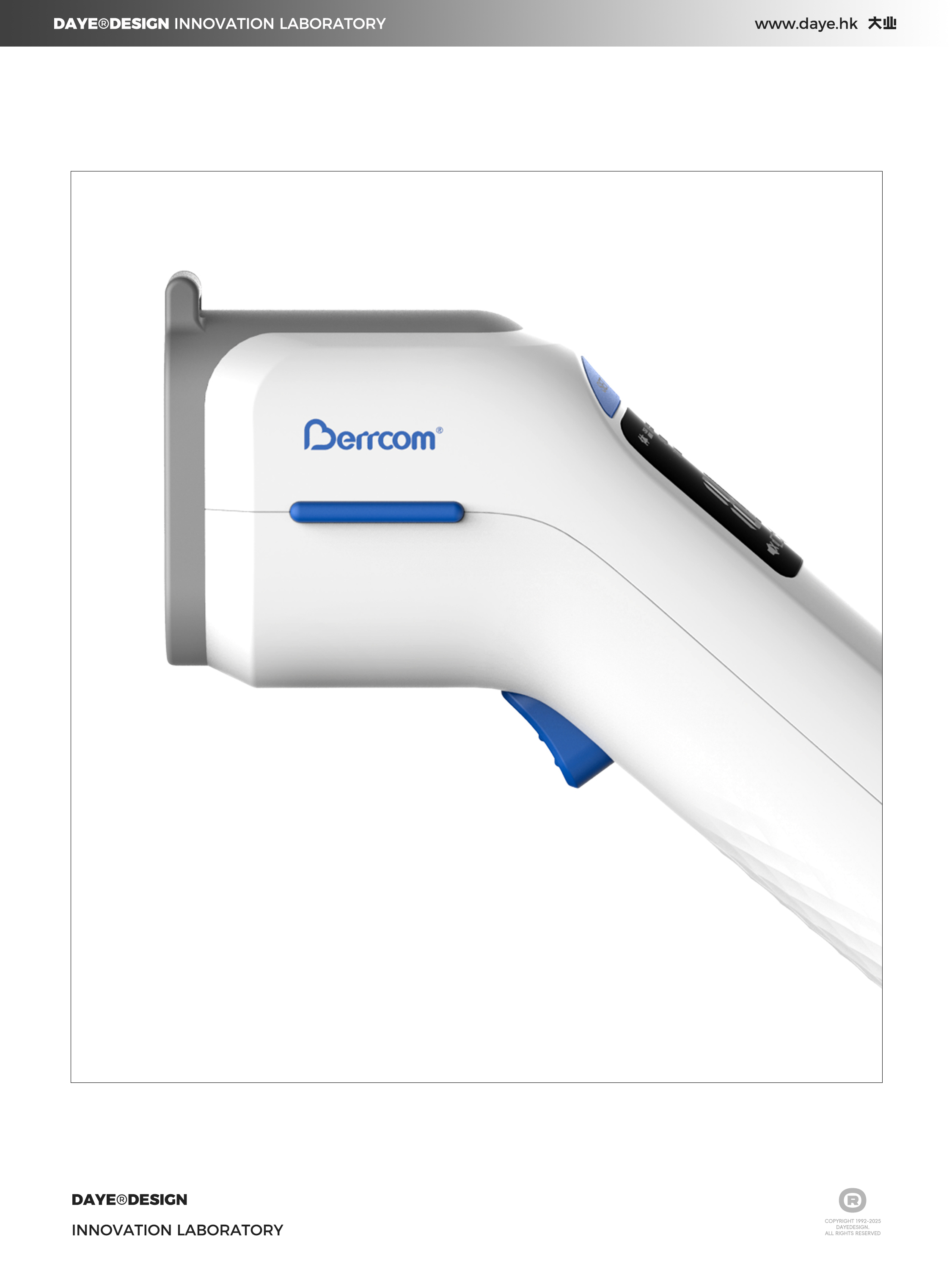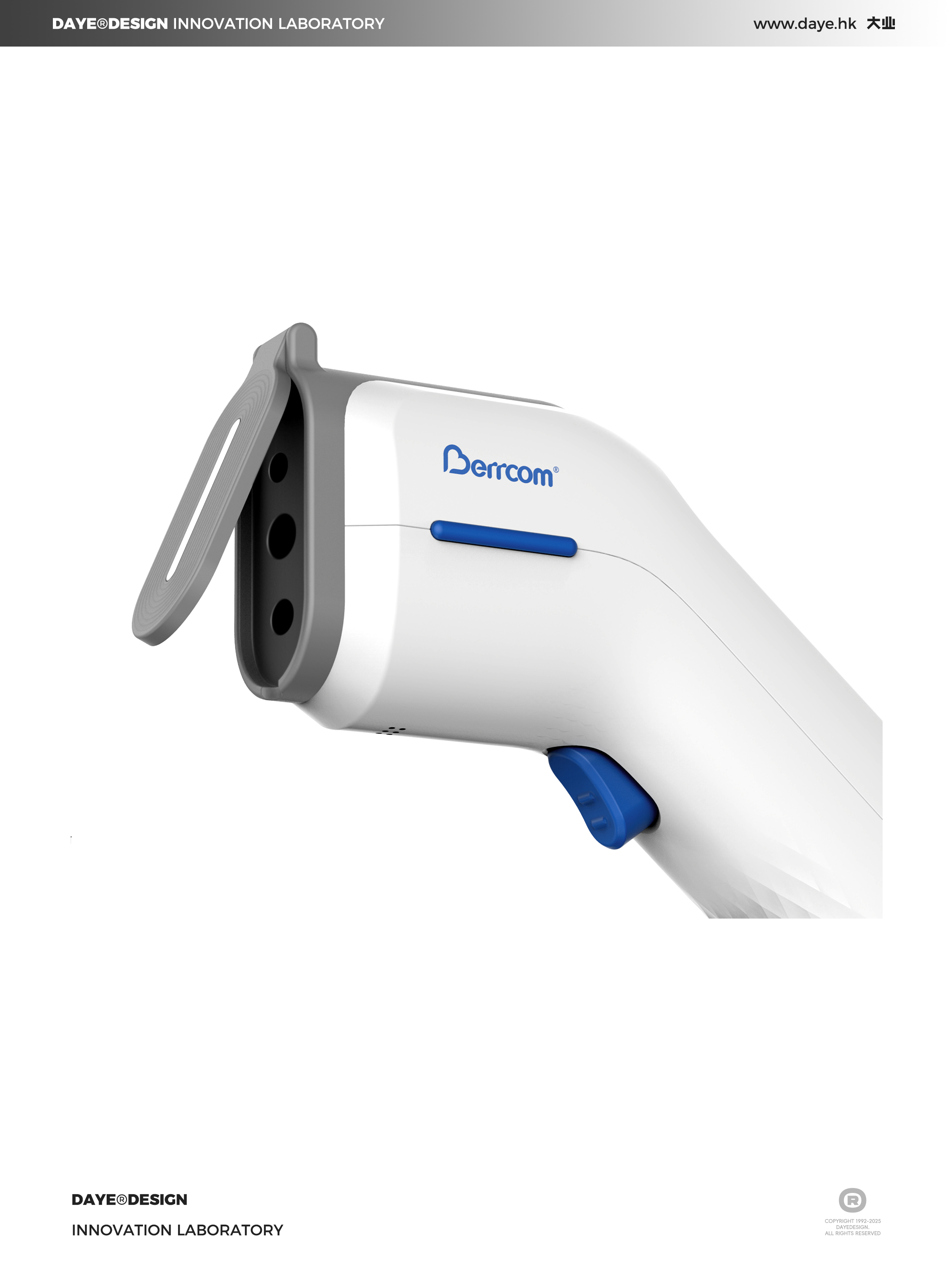 产品采用白、灰、蓝三色的医疗级配色体系:白色主体传递干净,灰色探头区域形成功能分区的视觉边界,强化探头作为核心工作部件的识别性;蓝色按键 则在中性色中形成视觉焦点,直观引导用户操作 。