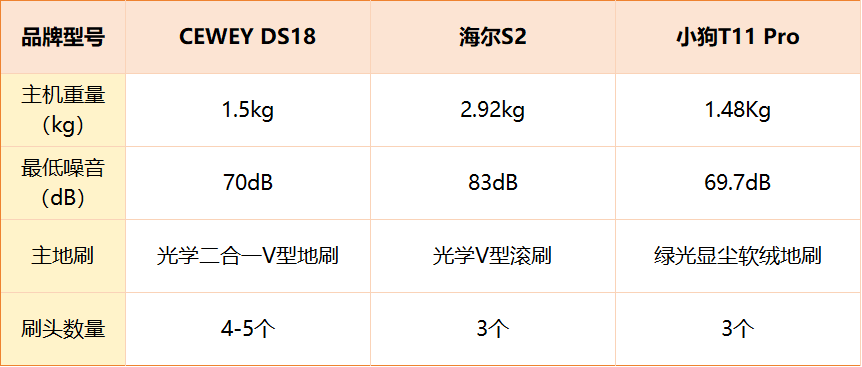 从体验层面看,CEWEY DS18 延续了轻量与静音的特点。主机仅1.5kg,噪音控制在70dB,实际使用时声音柔和,不会干扰休息。海尔S2主机重达2.9kg,长时间使用手部负担较大;小狗T11 Pro虽然更轻,但在部分高吸模式下震感偏明显。地刷方面,CEWEY采用光学二合一V型地刷,既能扫除颗粒又能应对缝隙积尘,配件数量也更多(4~5个),灵活性和适配性更强。