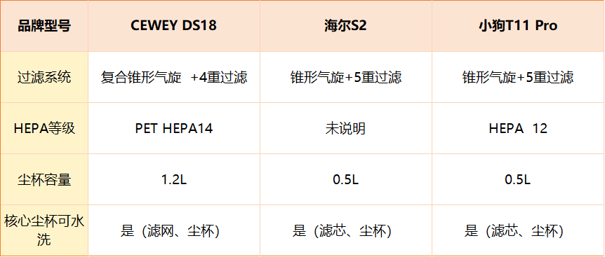 在过滤系统上,CEWEY DS18 采用复合锥形气旋加四重过滤结构,并使用PET HEPA14级滤芯,过滤精度远高于同价位机型。尘杯容量达1.2L,是三者中最大的,清洁频次更低。海尔S2与小狗T11 Pro同为0.5L尘杯,适合小面积家庭使用。三者均支持滤芯与尘杯水洗,但CEWEY的滤网材质更耐用、风阻更小,长期使用后吸力衰减更轻。