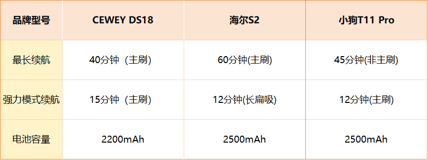 在续航表现上,三款产品的差距主要体现在电量释放效率上。CEWEY DS18 标准模式续航约40分钟,强吸模式约15分钟;海尔S2最长可达60分钟,但在强吸模式下仅12分钟左右;小狗T11 Pro续航与海尔S2相近,标准45分钟、强吸12分钟。虽然CEWEY的电池容量略小(2200mAh),但得益于电机效率高、能耗优化合理,续航表现稳定,不会出现吸力衰减快的情况。