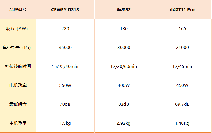 从性能数据来看,CEWEY DS18 的整体动力依然更具优势。它搭载550W无刷电机,输出吸力达到220AW,真空度高达35000Pa,电机转速达12万转/分钟。海尔S2和小狗T11 Pro虽然在各自定位中表现不错,但前者吸力仅130AW、真空度30000Pa,后者165AW、真空度21000Pa,功率相对偏低。从综合清洁力上看,CEWEY DS18不仅在吸力上更强,也能保持气流输出的持续稳定,尤其在清理地毯、毛发、碎屑等场景下表现更明显。