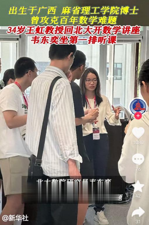 这是王虹回到母校举办的学术分享会,台下第一排坐着的正是韦东奕,田刚院士等权威人士也到场参与,讲座过程中,韦东奕一直认真聆听,偶尔低头记录,遇到关键的学术观点,还会微微前倾身体,专注的模样让人感受到他对知识的敬畏。