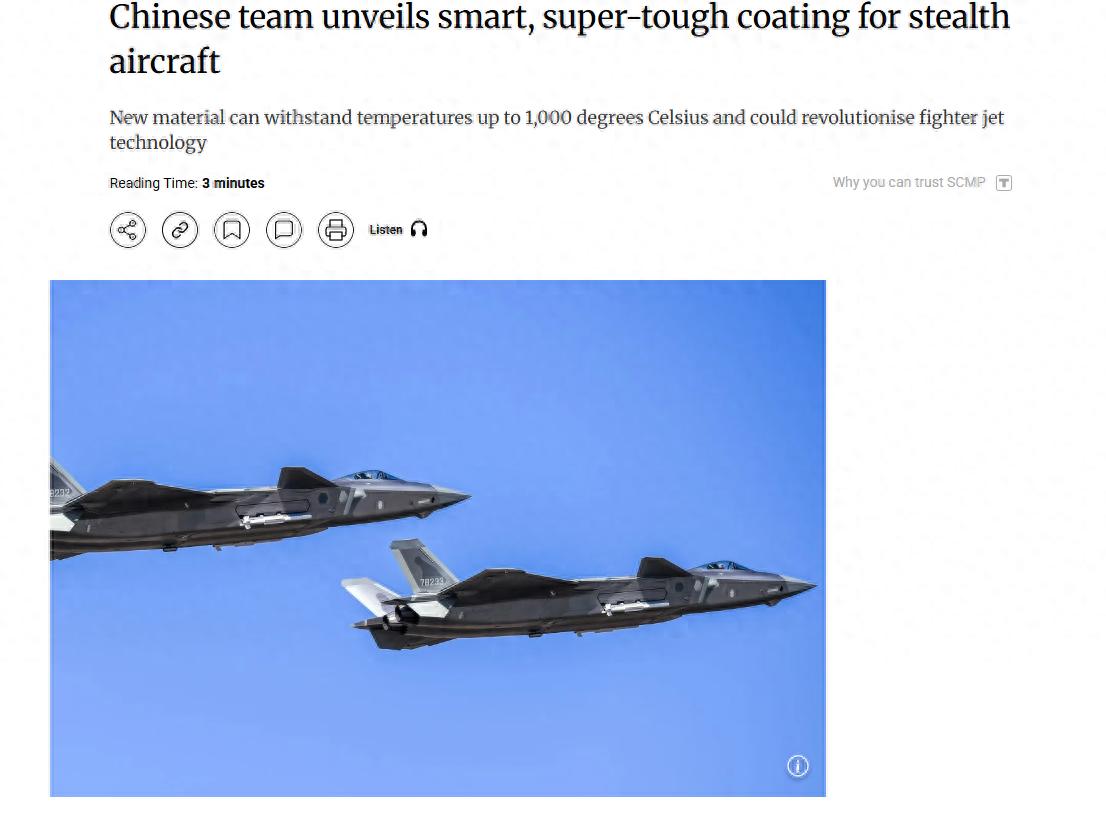 10月24日,香港《南华早报》报道称,中国团队研发出用于隐形飞机的智能超强涂层,新材料可承受高达1000 摄氏度的高温,可能彻底改变战斗机的隐身难题问题。并表示,这种灵活、耐用的飞机涂层,可以吸收雷达波,并重新定义空中隐身战机的未来。内容中提到,这一关键材料的论文于近期发表在《先进材料》国际学术期刊上,由北京大学、北京工业大学和哈尔滨工程大学的多名专家组成的团队联合发布,论文中详细介绍了一种可扩展、灵活且超薄的超表面隐身材料,并明确指出适用于航空航天电磁波吸收。