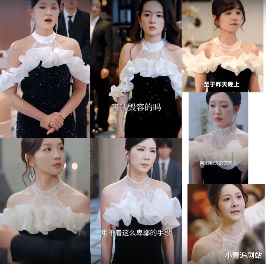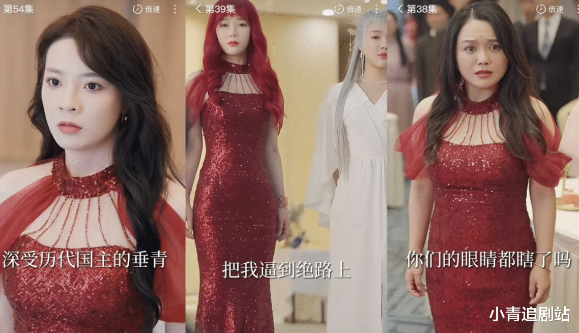 就,一模一样的款式,但服装材质肉眼可见的差,穿在短剧女演员身上,也是大大的不合适。腰身全部凸显出来,特别壮实,而且脖颈太短的,完全不适合用这个妆造。