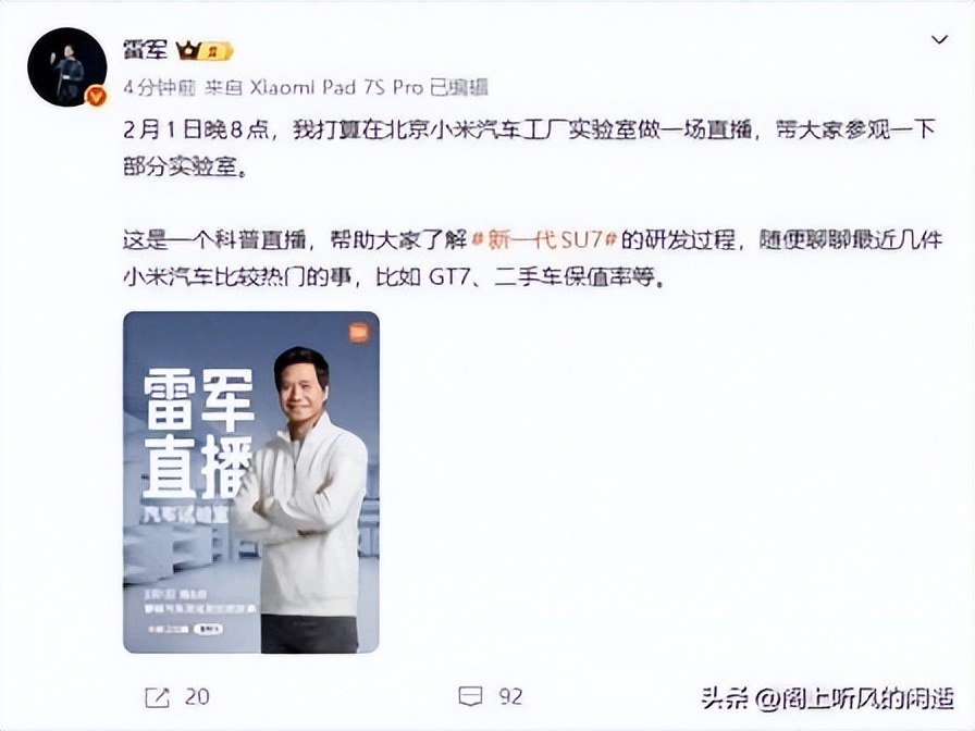 新能源汽车圈的热度,从来离不开小米的身影。今天,这份热度更是迎来顶峰——小米科技创始人雷军官宣,今晚(2月1日)8点将开启特别直播,亲自带队走进北京小米汽车工厂实验室,用约1小时全景揭秘新一代小米SU7的研发全过程,消息一出便引爆行业与消费者圈层的高度关注。