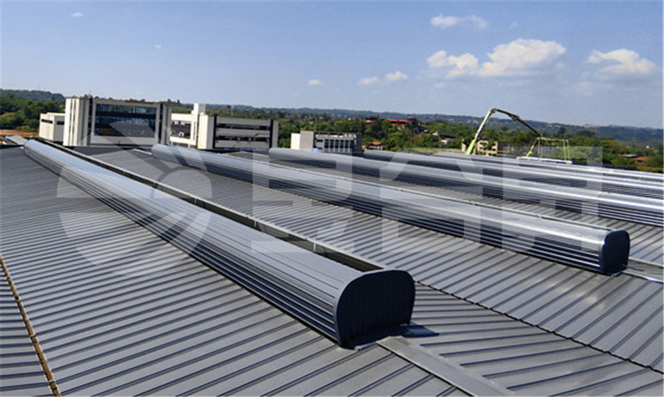 (3)屋脊大喉口通风器:喉口尺寸范围是1500-9000mm,通风器体积大、通风量大、布局合理、空气流通畅顺,流动阻力小,能有效防止室外空气倒灌及雨、雪渗透。流线型通风器主要是被运用于焊接、铸造、冶金、炼铁等高温高热厂房。
