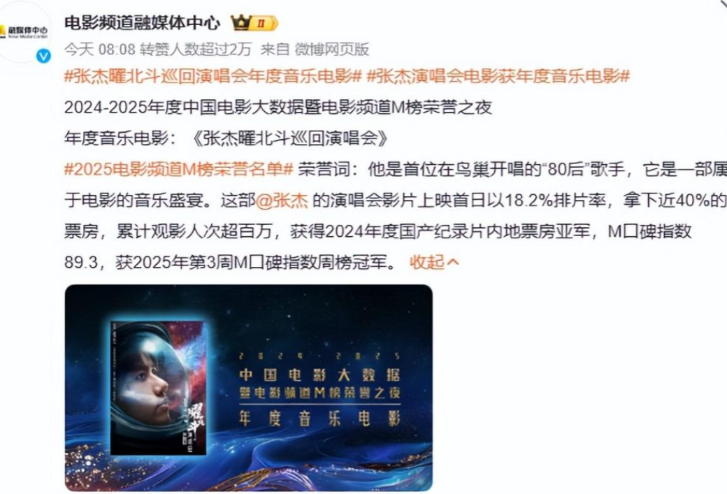然而,不到一年时间,张杰高调官宣新喜讯:获央视认可,为影片制作的音乐赢得“年度音乐电影”奖。