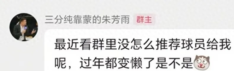 广东已经训练一段时间了,朱芳雨则在粉丝群开始整活了。他先是在粉丝群上表示:最近看群里没怎么推荐球员给我呢,过年都变懒了是