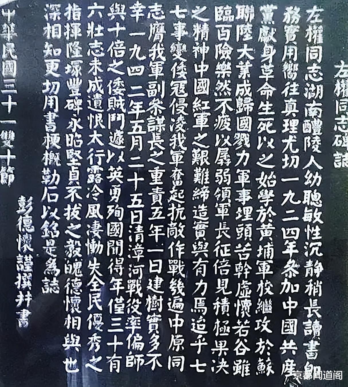 彭德怀曾为他的军事搭档、八路军参谋长左权烈士用楷书亲笔书写墓志,颜楷风格,端正雄质,用笔用墨,十分清质准确,一丝不苟,端正心态涌然而现,成为彭德怀楷书功成的重要例证。