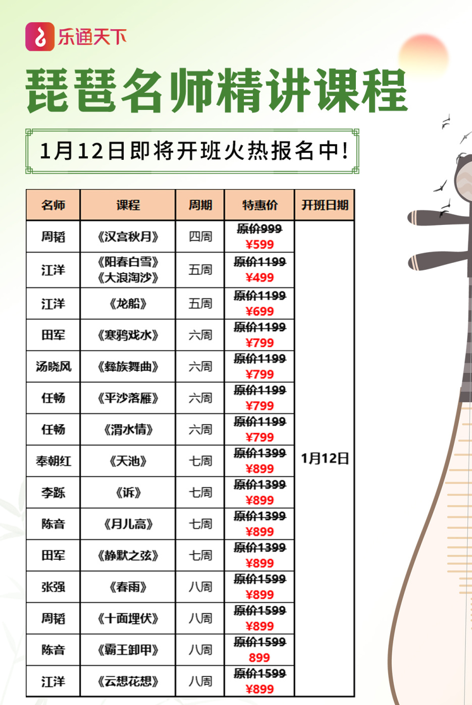 跟随乐通天下特邀著名琵琶演奏家江洋 老师逐音摸谱,逐句精讲学习,都将实现从“弹得对”到“弹得好”的突破,从零拿下《阳光》全曲!