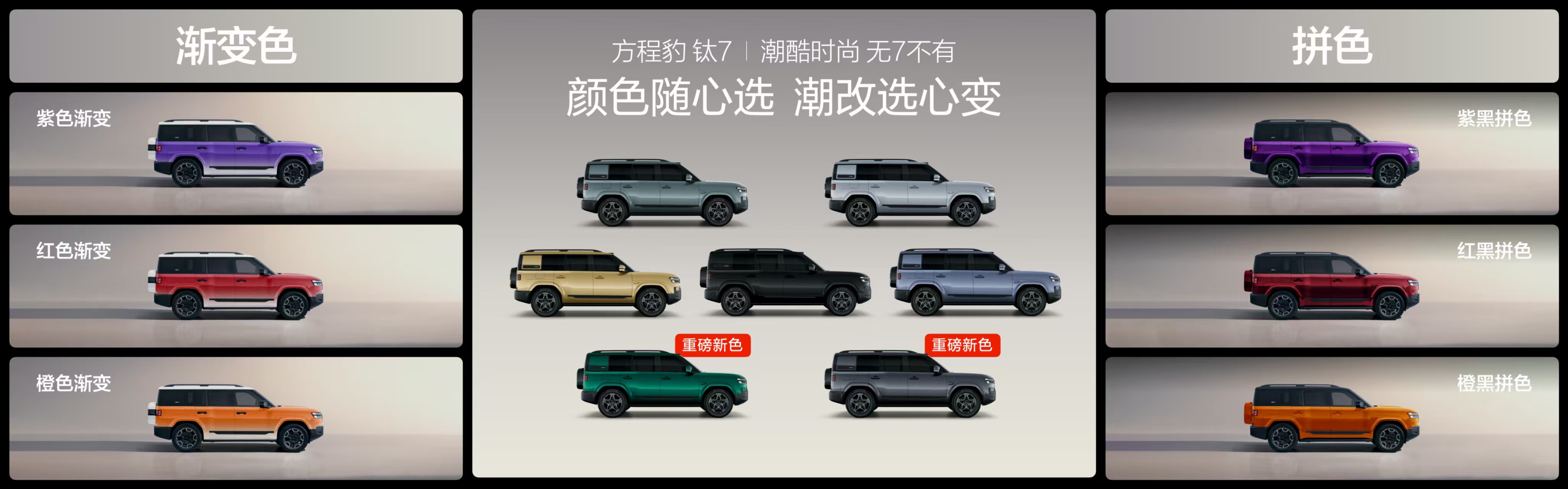 3.配色很丰富,带来了7款外观颜色、3款内饰颜色,同步在官方商城上架了6款潮改方案