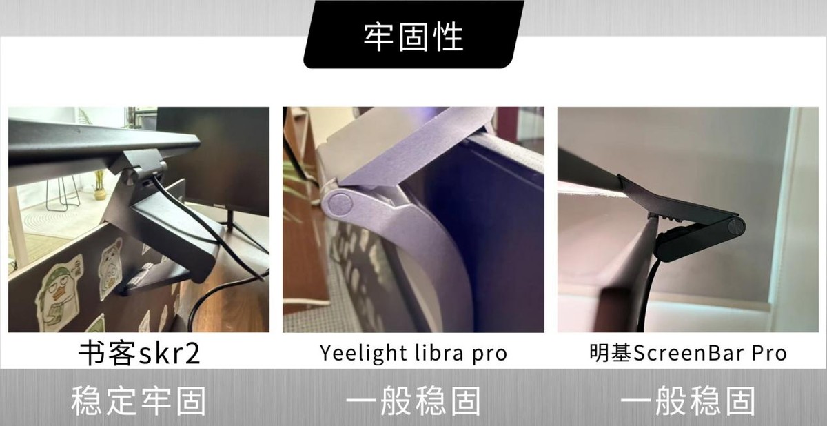 第二梯队:Yeelight Libra Pro、明基 ScreenBar Pro这两款在稳定性方面表现相对中规中矩,经过摇晃测试时会出现轻微位移,但不影响正常使用。日常场景下只需稍加注意即可保持稳固,不过在长时间使用或频繁调整时,牢固性和稳定性相比第一梯队仍有一定差距。