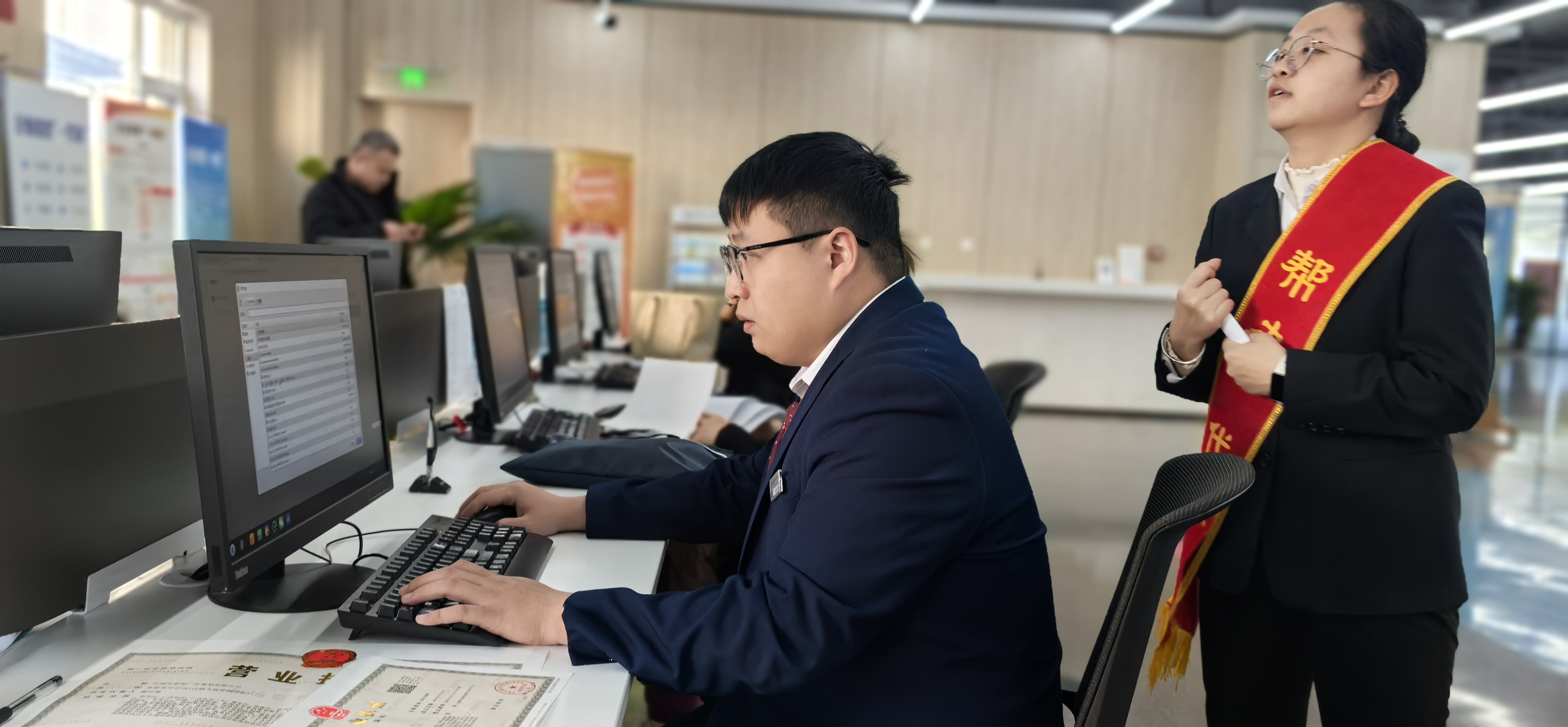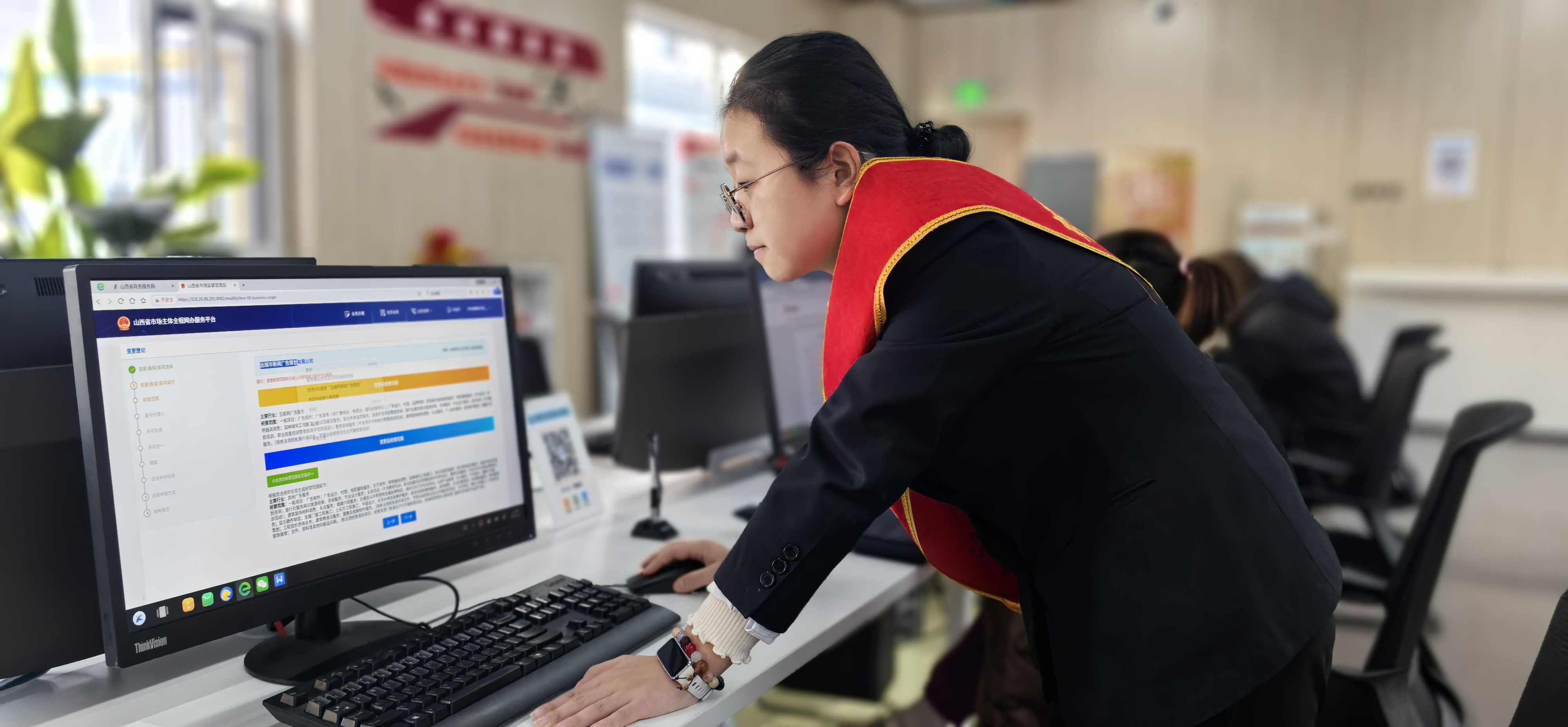 2025年12月3日,盐湖区政务大厅办证负责人正在指导审核证照。当日一市民到盐湖区政务大厅办理营业执照经营范围变更。刚进门,帮办工作人员便主动上前询问,耐心指导其整理变更申请书、原执照等材料,还细致核对经营范围的规范表述。全程“一对一”协助填报、提交,无需多跑一步,短短半小时就办结完毕。高效的服务与暖心的态度,让冬日办事满是暖意。董应赞摄