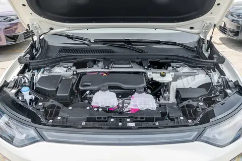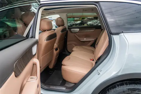 车身侧面的线条很舒展,4780/1905/1658mm的长宽高搭配2930mm轴距,典型的中型SUV身材,却没有臃肿感。悬浮式车顶和20英寸大轮毂让侧面看着更运动,绿色的刹车卡钳是点睛之笔,悄悄透点活力。最让人惊喜的是无框车门,这种常出现在豪华车上的配置,居然在15万级车型上标配了,开关门时的仪式感一下就上来了。隐藏式门把手能自动弹出,不仅好看,还能进一步降低风阻。