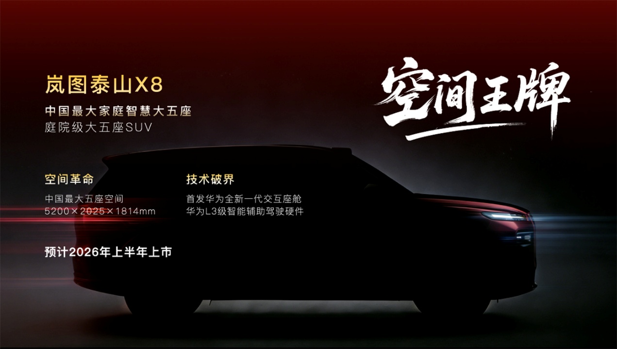 紧随其后,旨在“横扫8系”的岚图泰山X8,则展现了岚图在细分市场进行“技术降维打击”的思路。这款定位“庭院级大五座SUV”的车型,最大亮点在于继承了问界M9同款的顶级四激光雷达配置,直接将智驾安全与感知能力的起点拉升至行业第一梯队。配合首发搭载的华为新一代交互座舱,其在人机共融与场景智能上或将树立新范式。车身尺寸达到5200mm×2025mm×1814mm,堪称目前中国市场上尺寸最大的大五座SUV,其“庭院级”的空间概念,旨在为用户提供超越同级的宽敞与通透感。泰山X8的推出,不仅填补了岚图在大五座豪华SUV市场的空白,更凭借激光雷达、智能座舱与极致空间的三重优势,有望在竞争激烈的中大型SUV市场开辟出独特的“智慧家庭空间”新赛道。