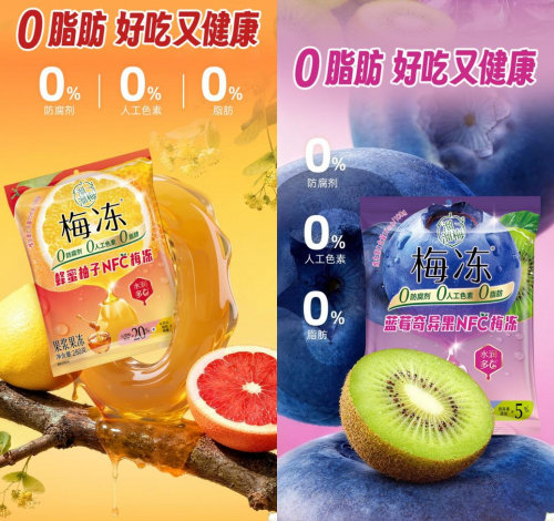 蜂蜜柚子NFC梅冻与蓝莓奇异果NFC梅冻延续了溜溜梅梅冻的健康理念,真正做到了“0防腐剂、0人工色素、0脂肪”,且均富含天然VC,维生素含量15mg/100g,日常食用可帮助补充身体所需维生素,为健康生活增添一份天然助力,无论是秋冬清润、饭后解腻、欢聚分享还是日常解馋,都是便捷又健康的选择。