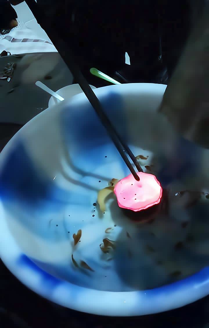 视频中的男子,先是用烧煤用的煤炉,烧旺火,然后将几片瓦片放在了煤炉中,将瓦片烤红。