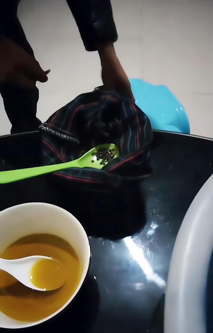 接着用一个脸盆垫在地上,将烤红的瓦片用钳子夹出来后放在盆里,再将事先准备好的油菜籽挖一勺放在烤红的瓦片上,接着在瓦片上撒上一勺菜籽油。